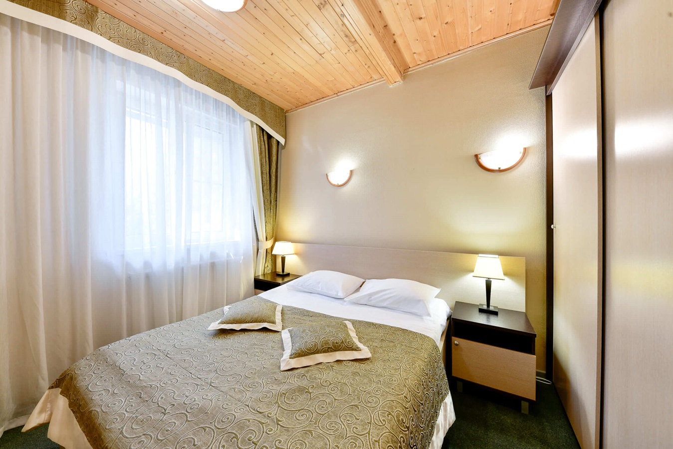 При проживании в гостиничном корупсе в стоимость входит 3х-разовое питание по системе «шведский стол» в ресторане Волга, при проживании в коттеджах и таунхаусе: только завтрак, также можно выбрать тариф без питания.